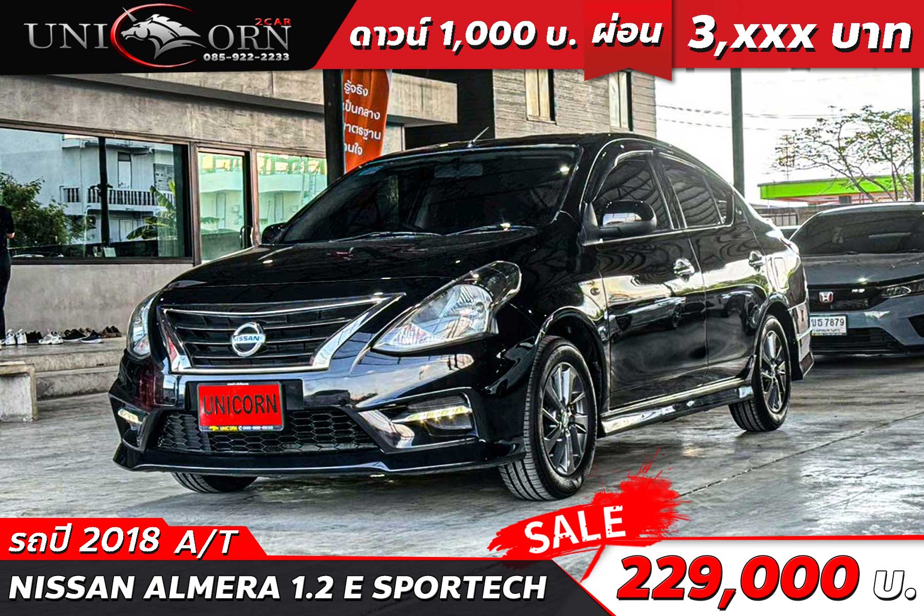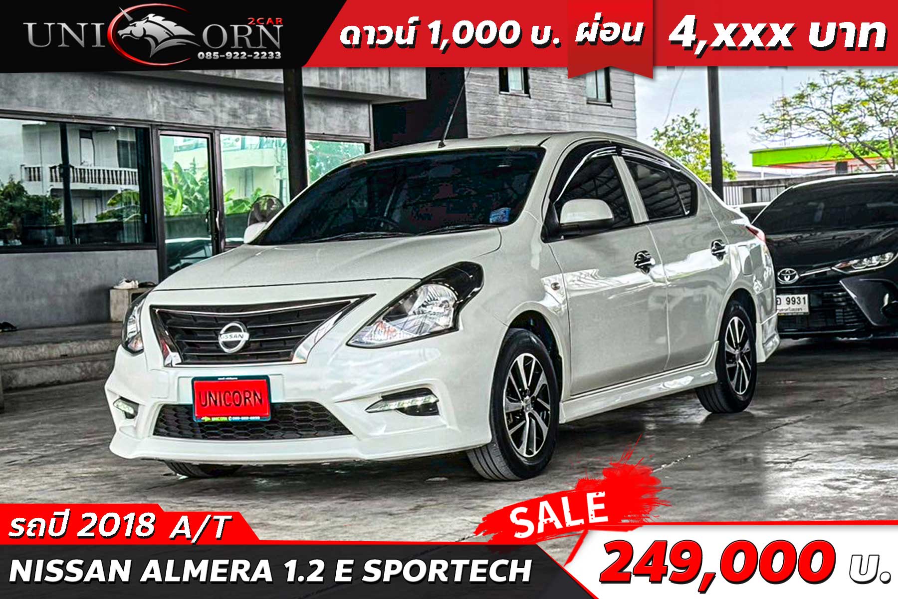 ชื่อรุ่น: NISSAN ALMERA 1.2 E SPORTECH ปี: 2018 ไมล์: 89,239 km ราคา: 249,000 บาท ผ่อน 84งวด = 4,169 (ค่างวดจะแตกต่างกันตามธนาคารและดอกเบี้ย) Option มาตรฐาน - เครื่องยนต์เบนซิน 1.2 ลิตร 3 สูบ DOHC 12V - กำลังสูงสุด 79 แรงม้า - แรงบิดสูงสุด 106 นิวตันเมตร - เกียร์อัตโนมัติ Xtronic CVT - ระบบขับเคลื่อนล้อหน้า (FWD) - กันชนหน้า-หลัง สปอร์ตแบบ Sportech - กระจังหน้าสีดำเงา - ไฟหน้าแบบฮาโลเจน มัลติรีเฟล็กเตอร์ - ไฟท้ายแบบมัลติรีเฟล็กเตอร์ - ไฟเลี้ยวที่กระจกมองข้าง - มือจับประตูโครเมียม - ล้ออัลลอยทูโทน - ภายในโทนสีดำ - เบาะผ้าสีดำเดินด้ายสีแดง - เบาะนั่งด้านหลังพับได้ 60:40 - พวงมาลัยยูรีเทน 3 ก้าน - มาตรวัดเรืองแสง Fine Vision Meter พร้อมจอ MID - ระบบปรับอากาศธรรมดา - กระจกไฟฟ้ารอบคัน (One-touch ด้านคนขับ) - กุญแจรีโมท - รองรับ USB / AUX / วิทยุ - ลำโพง 4 ตำแหน่ง - ถุงลมนิรภัยคู่หน้า (Dual SRS Airbags) - ระบบเบรก ABS / EBD / BA - ระบบกุญแจ Immobilizer + Alarm - เซ็นเซอร์ถอยหลัง
